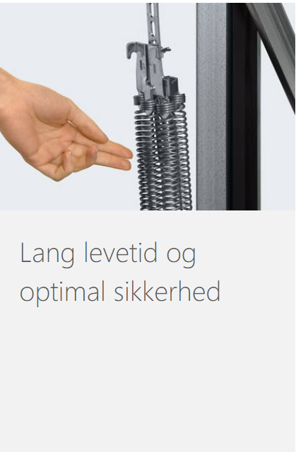 Porten er afbalanceret med et Multi-fjedersystem i begge sider, som er skærmet af med beskyttelses klapper, så man ikke får noget i klemme.